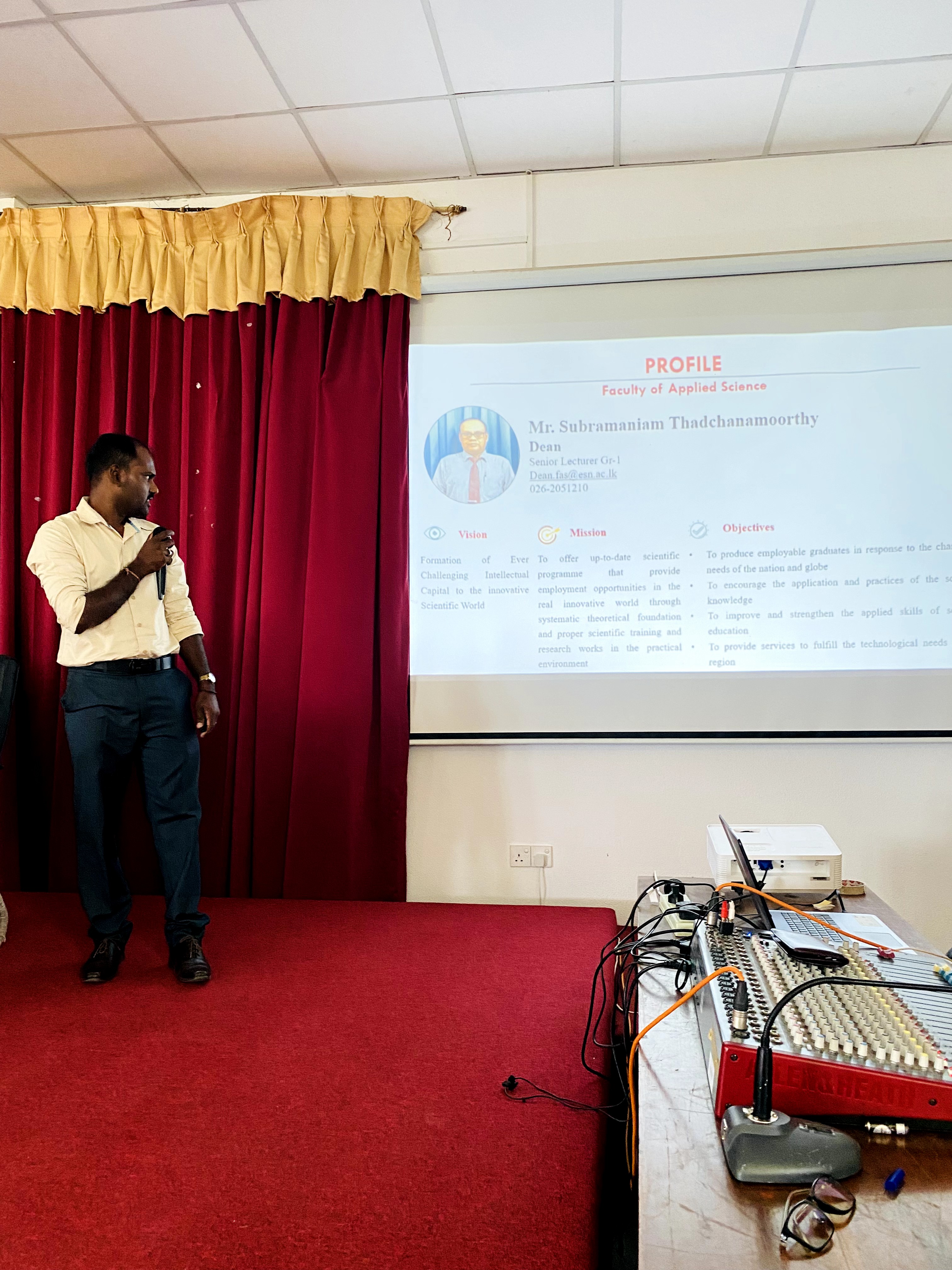 The programme commenced with the lighting of the traditional oil lamp. A welcome address was presented by the Student Representative, followed by the inaugural address delivered by Mr. Subramaniam Thadchanamoorthy, Dean of the Faculty, and a special address by Prof. K.T. Sundaresan, Rector of the Campus. The Heads of Departments of Computer Science and Physical Science also addressed the gathering. The event concluded with a Vote of Thanks delivered by Mrs. V. Niththiya, Assistant Registrar, Faculty of Applied Science.